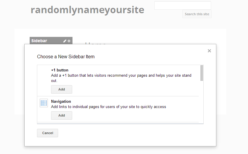 Customize the Sidebar. The sidebar appears on all the pages of your site. You can customize it with different items and links, and even move it around on the page. Choose the options dropdown menu and select edit site layout from there. The Sidebar will be highlighted, select the + symbol from there. A dialog will appear allowing you to add pages to the sidebar (image below). Select the item you would like to add into your page; then add the them. Eventually, you'll add links to your major projects and checklists.